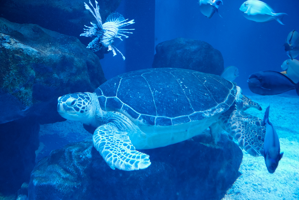 Met this guy over the weekend at the Shinagawa Aquarium. I was on the lookout anyway because the wife loves sea turtles, so seeing one in the large main aquarium area was a nice surprise. But that was just the beginning — I love the attitude you can just sense through the glass and get a glimpse of here. He seemed to be completely unfazed by his lot in life — except, perhaps, by the moray eels he wanted to get Out Of The Way so he could just Take A Nap in those rocks over there. He’s not worried about the throngs of families and little kids passing by, he just wants those damn eels to get off his couch so he can put the golf on and take a nap.